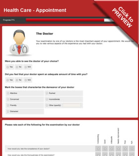 A customer survey form for a health care visit that includes ratings for the appointment,