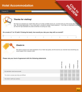 A hotel satisfaction survey rating check-in, guest rooms, hotel staff, food & dining,
